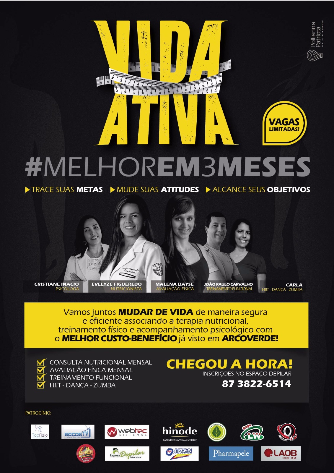 A Eccos TV esta apoiando e patrocinando através de sua mídia indoor na cidade de Arcoverde o projeto Vida Ativa,idealizada pela nutricionista Evelyze Figueiredo é um projeto focado na perca de peso coletivo,a os que aderirem ao projeto terão o beneficio durante os 90 dias de projeto(Outubro a Dezembro) terão acompanhamento com a nutricionista,avaliação física,psicologa e pra ajudar a perca de peso exercícios como Hits e funcional de segunda a sexta no SESC.