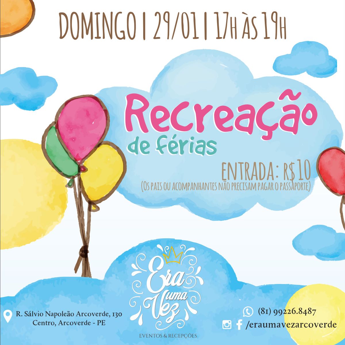 A recreação de férias da Era uma vez Arcoverde vai acontecer esse domingo das 17 às 19h com várias brincadeiras e atividades para as crianças você não pode perder ! Vai ser super divertido e por apenas R$10 lembrando que pais e acompanhantes não pagam.