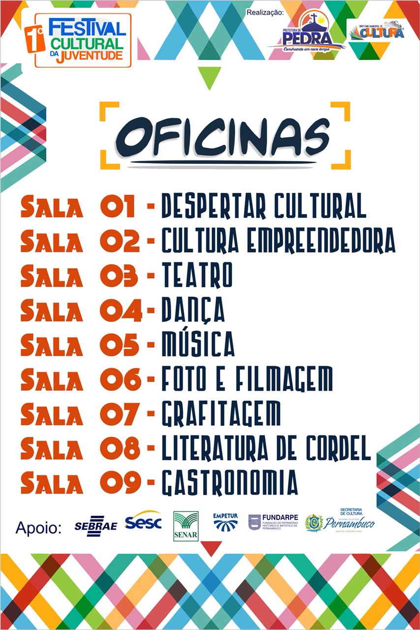 Gincana Cultural – A abertura da primeira edição do Festival Cultural da Juventude da Pedra será às 13h do dia 28 de setembro, na Quadra Poliesportiva do município, com a realização da 1ª Gincana Cultural Escolar. Na oportunidade, estudantes das escolas municipais participam de atividades culturais numa competição onde todos saem ganhando conhecimento e muito aprendizado.
