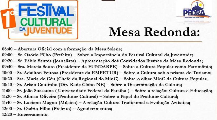 Uma mesa redonda com o tema Falando de Cultura será realizada no dia 30, no Clube Polimático, a partir das 8h40. Estarão presentes o prefeito do município, Osório Filho, a presidente da Fundarpe, Márcia Souto, o presidente da Empetur, Adailton Feitosa, a chefe da regional do Ministério da Cultura, Maria do Céu, o diretor da Rede Globo Nordeste, Arísio Coutinho, entre outros.